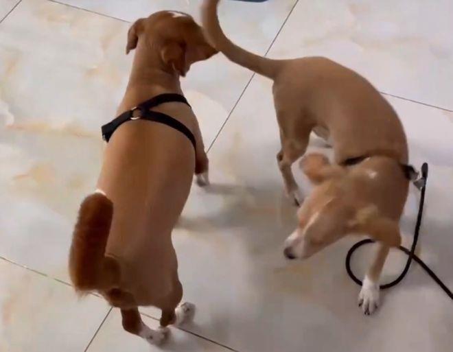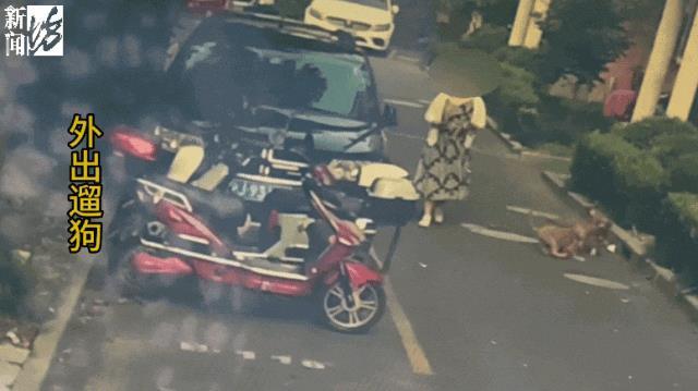 记者:我看探头就是你遛了两只狗下去,一个狗牵着,另外一个小狗还在跟这个小狗互动。