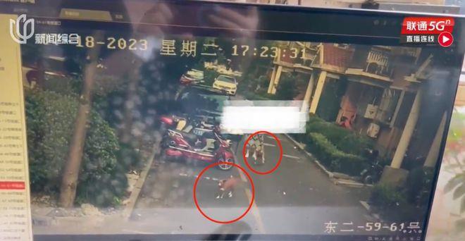 物业公共视频显示,一位业主带了两只狗在小区里散步,其中一只体型稍大、四蹄为白色的狗未牵绳。随后在花园里,未牵绳的狗扑向女孩腿部。